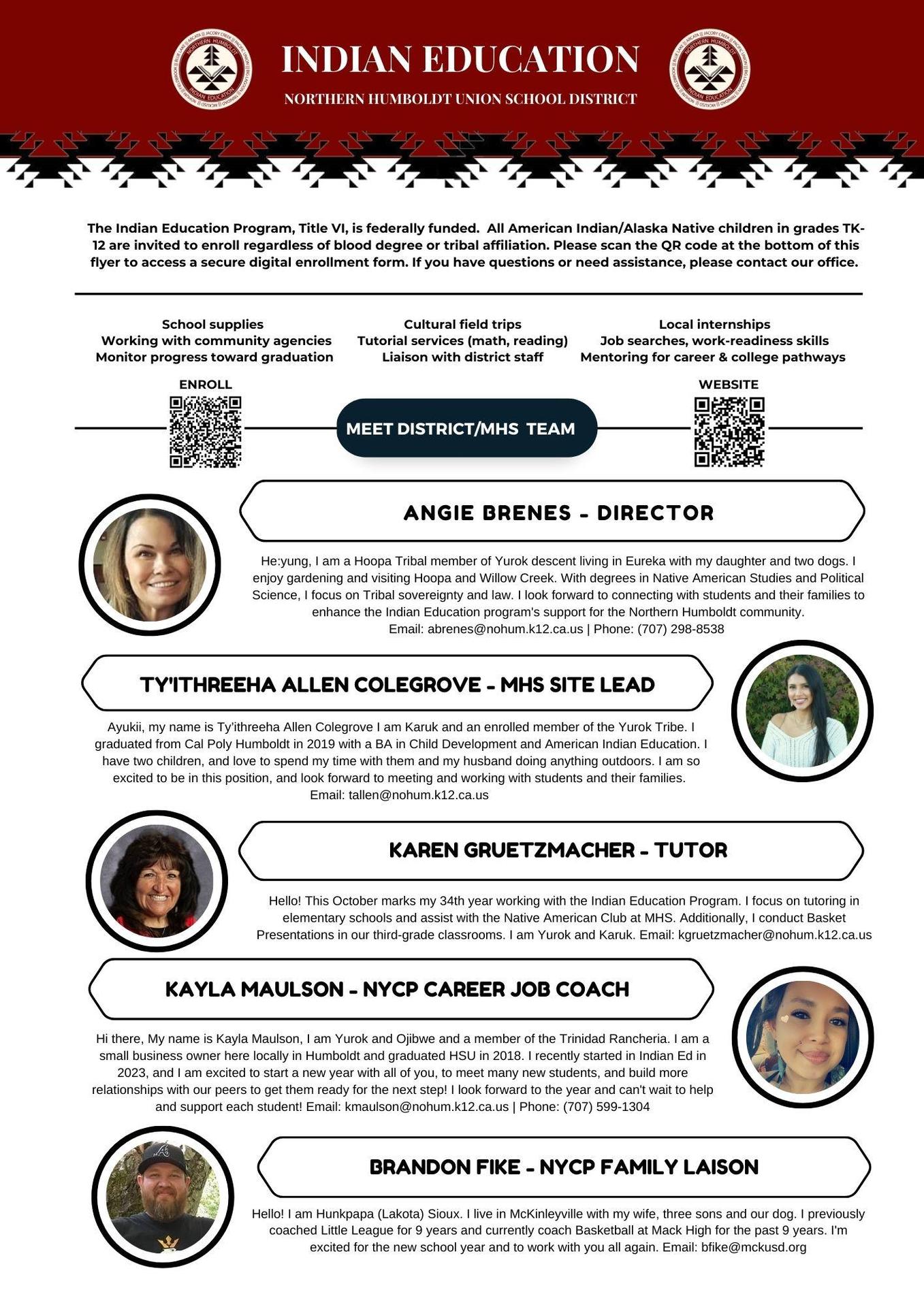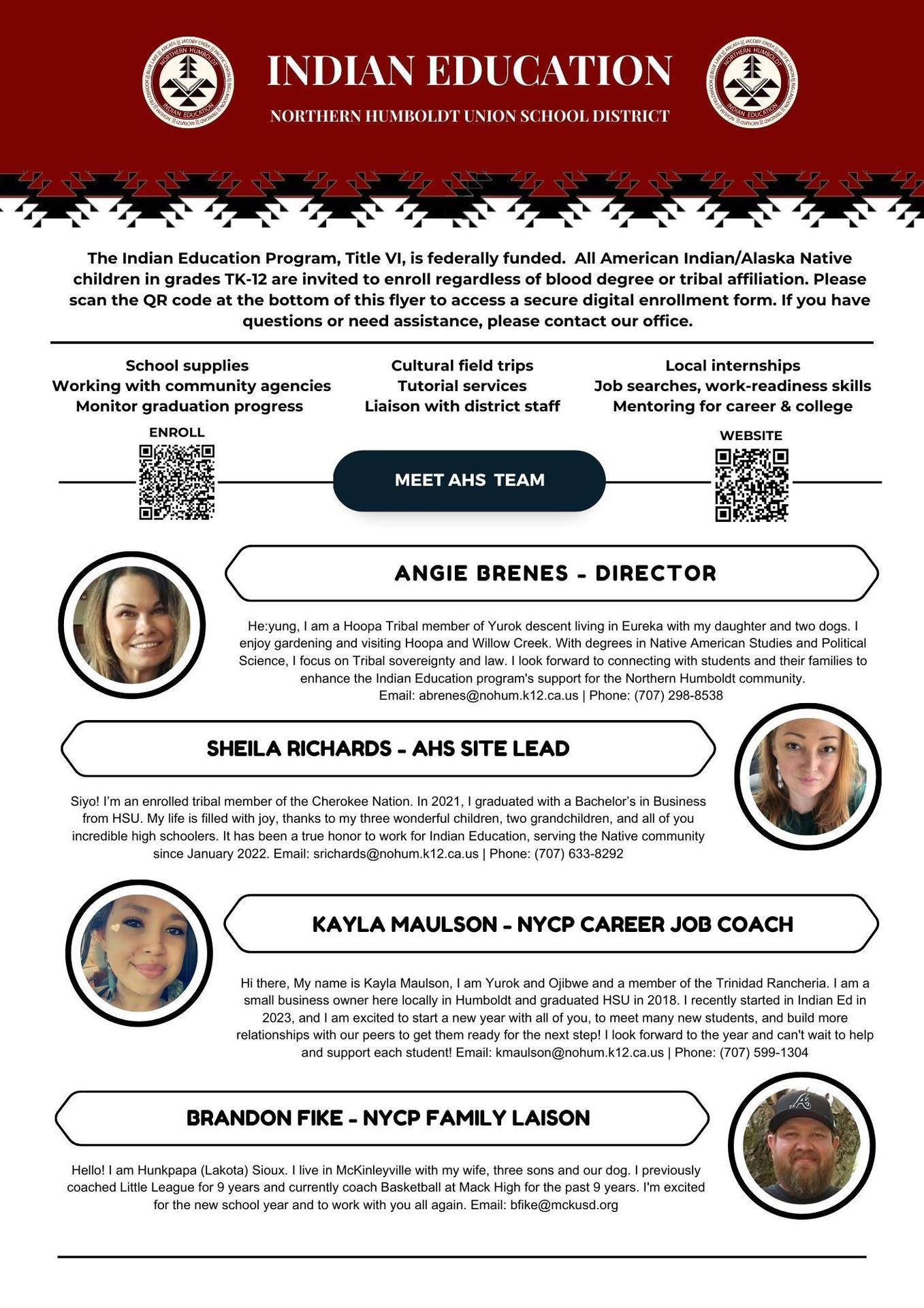Contact Us: If you have any questions about the Indian Education program, please contact Angie Brenes. For student support services, see additional contact information below.